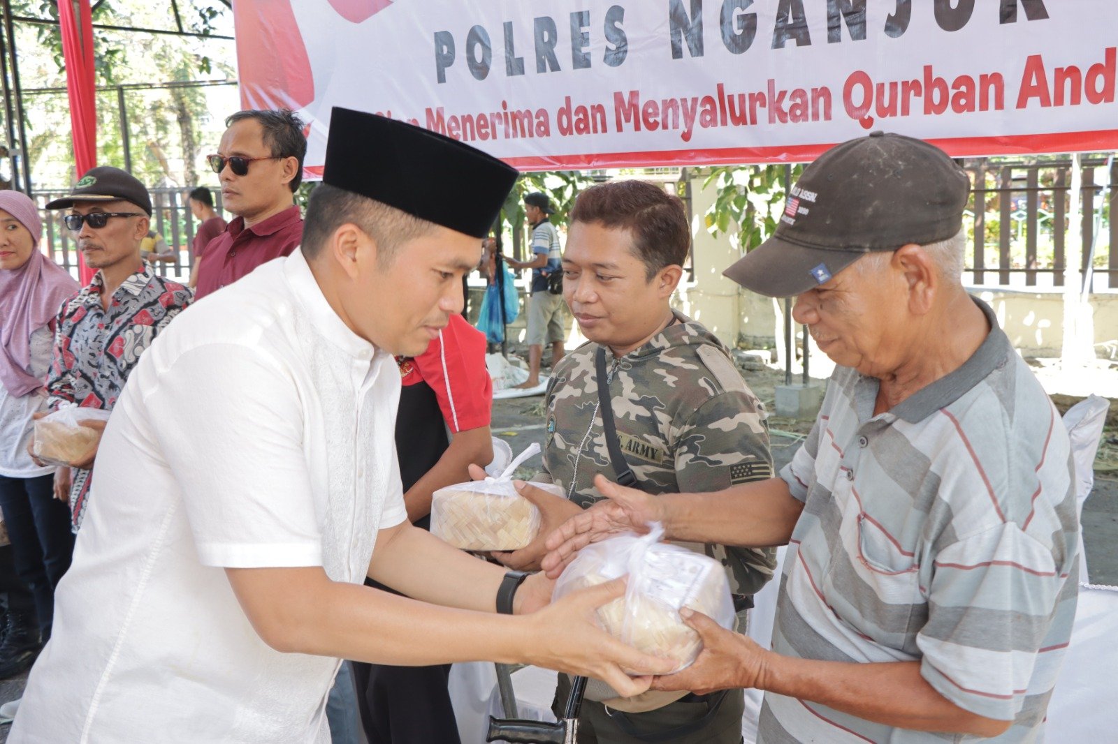 Dalam rangkaian acara tersebut Polres Nganjuk juga membagikan ribuan paket daging kurban dari keluarga besar Polres Nganjuk kepada warga sekitar mapolres, tuna netra, penyandang disabilitas, ojek online, tukang becak, dan pedagang asongan.