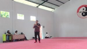 Ketua Wushu Indonesia (WI) Cabang Nganjuk, Abdul Wakid saat memberikan pengarahan dan pembinaan kepada para peserta Sparring.(Poto: ifakta. co /may).