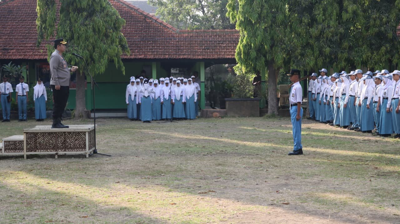 Kapolres Nganjuk AKBP Henri Noveri Santoso tengah memberi himbauan pada para siswa SMKN 1 Nganjuk pada upacara bendera hari Senin di halaman sekolah.(Poto: istimewa).