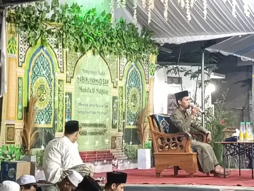 TANGERANG, ifakta.co – Suasana Musholah Al-Mukhlisin, Desa Sidoko, Kecamatan Gunung Kaler, Kabupaten Tangerang, terasa syahdu pada Sabtu malam (7/9/2025). Lantunan merdu ayat suci Al-Qur’an dari Qori Internasional asal Bima, Nusa Tenggara Barat (NTB), H. Syamsuri Firdaus, menggema hingga memenuhi ruang acara peringatan Hari Besar Islam (PHBI) Maulid Nabi Besar Muhammad SAW.