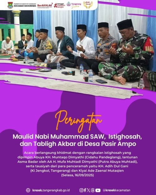 TANGERANG, ifakta.co– Camat Kresek, Eka Fathussidki, bersama Kepala Desa Pasir Ampo menghadiri Peringatan Maulid Nabi Muhammad SAW 1447 H yang dirangkaikan dengan Istighosah dan Tabligh Akbar di Masjid Jami’ Al-Muttaqin, Kampung Kosambi, Desa Pasir Ampo, Kecamatan Kresek.