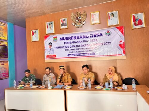 TANGERANG, ifakta.co — Kepala Desa Mekar Baru, Sujai, memimpin langsung kegiatan Musyawarah Perencanaan Pembangunan Desa (Musrenbangdes) dalam rangka penyusunan Rencana Kerja Pemerintah Desa (RKPDes) Tahun 2026 dan DU-RKPDes Tahun 2027 yang berlangsung di Aula Kantor Desa Mekar Baru, Kecamatan Mekar Baru, Kabupaten Tangerang, Senin (6/10/2025).