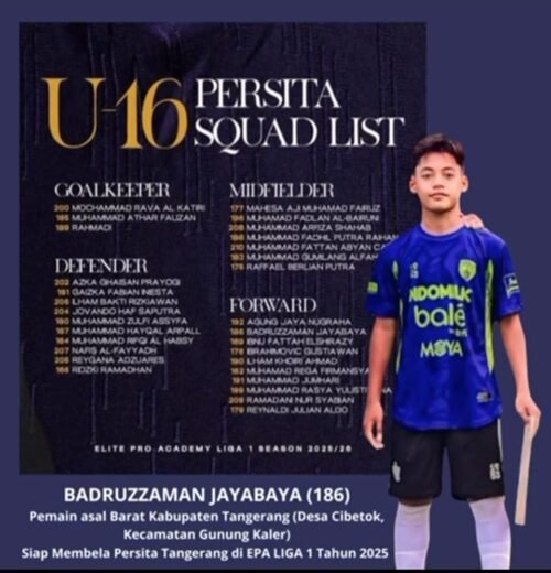 TANGERANG, ifakta.co – Prestasi membanggakan datang dari dunia pendidikan Kabupaten Tangerang. Badruzzaman Jayabaya, siswa kelas VIII MTsN 4 Kabupaten Tangerang, sukses menembus skuad Persita Tangerang U-16 untuk berlaga di kompetisi Elite Pro Academy (EPA) Liga 1 2025/2026.