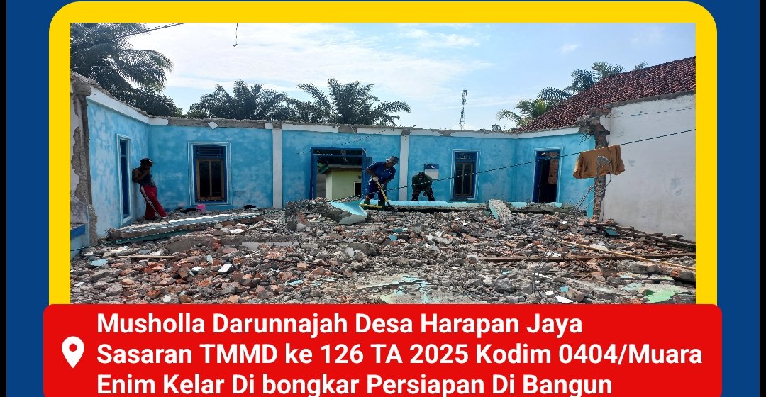 MUARA ENIM, Ifakta.co – Musholla Darunnajah di Desa Harapan Jaya menjadi salah satu sasaran utama dalam program Tentara Manunggal Membangun Desa (TMMD) ke-126 tahun anggaran 2025 yang diselenggarakan oleh Kodim 0404/Muara Enim.