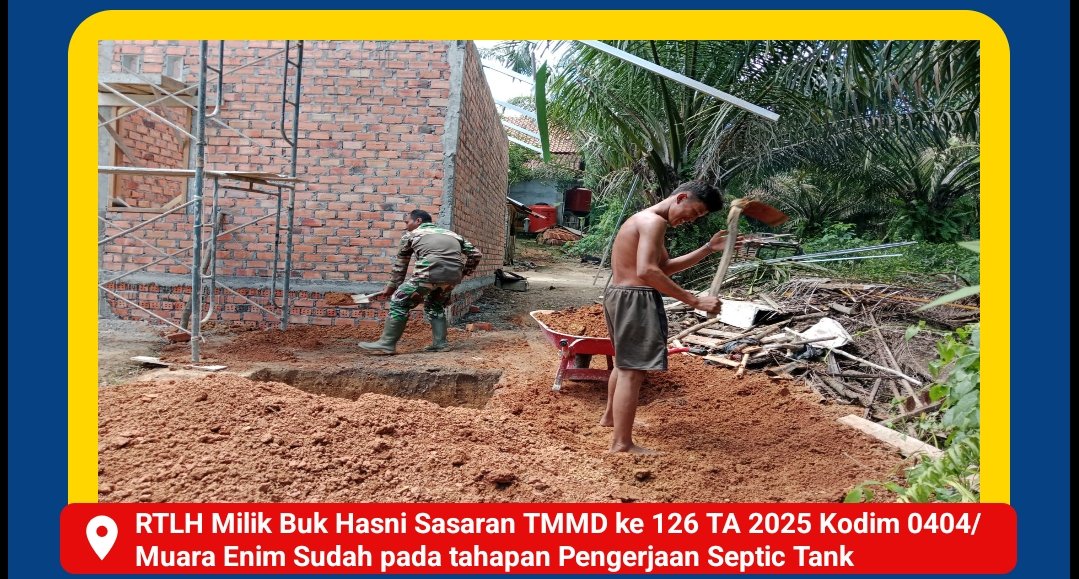 MUARA ENIM, Ifakta.co – Sebagai bagian dari komitmen untuk meningkatkan kesejahteraan masyarakat, Tentara Manunggal Membangun Desa (TMMD) ke-126 TA Kodim 0404/Muara Enim melaksanakan pembangunan septic tank bagi Rumah Tidak Layak Huni (RTLH) milik Buk Hasni, warga Desa Harapan Jaya, Kecamatan Muara Enim, Kabupaten Muara Enim, pada Senin (13/10/2025).