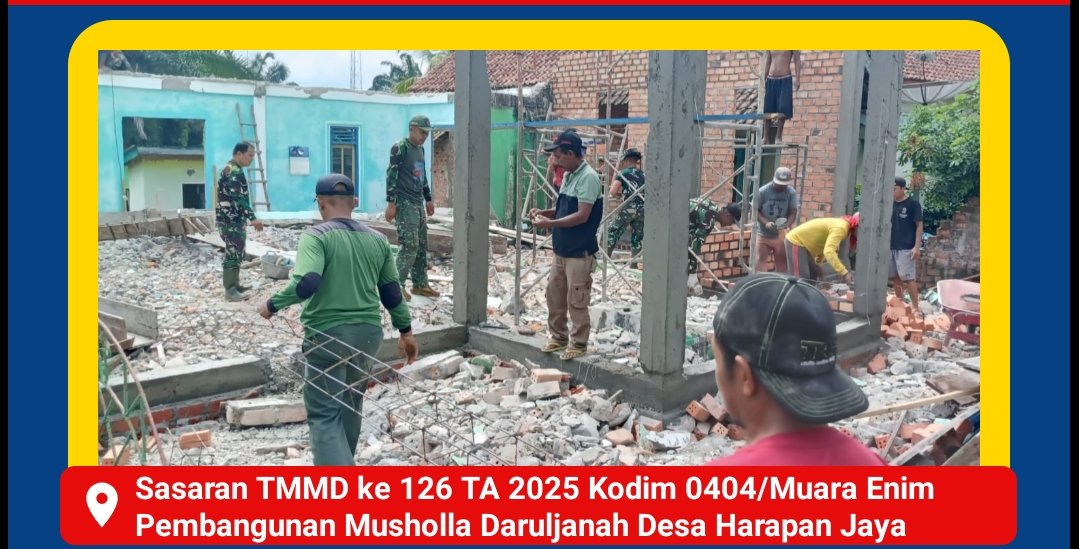 MUARA ENIM, Ifakta.co – Program TNI Manunggal Membangun Desa (TMMD) ke-126 TA 2024 Kodim 0404/Muara Enim terus menunjukkan progres signifikan dalam pembangunan Musholla Daruljanah di Desa Harapan Jaya, Kecamatan Muara Enim.