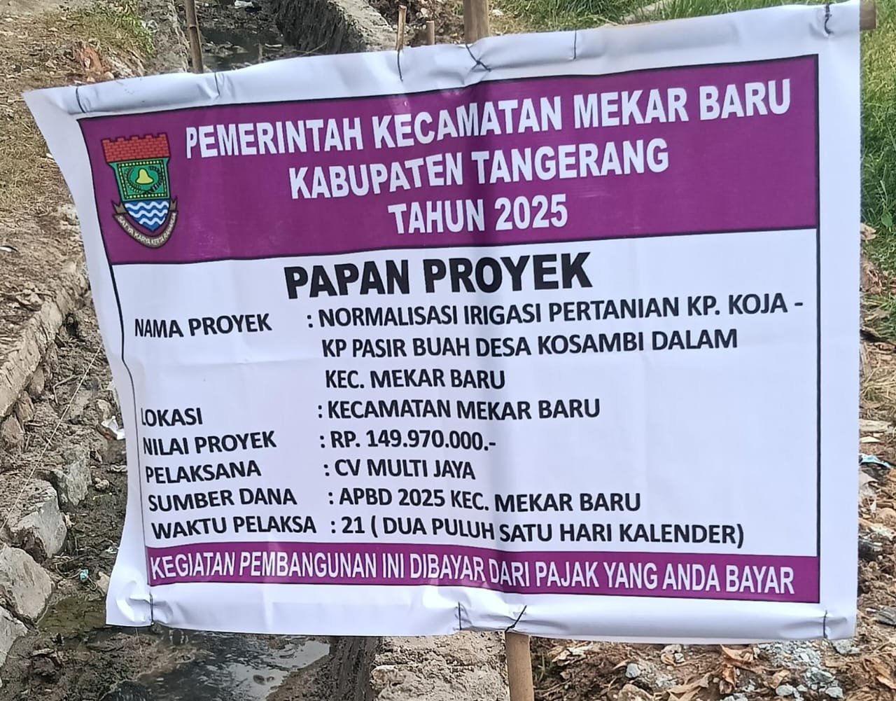 Sementara itu, Ramdani yang dikenal sebagai pihak yang dipercaya mengatur pelaksanaan proyek membenarkan bahwa pekerjaan normalisasi irigasi di Desa Kosambi Dalam dikerjakan oleh CV Multi Jaya dengan nilai kontrak Rp149.970.000, waktu pelaksanaan 21 hari, bersumber dari APBD 2025 Kecamatan Mekar Baru.