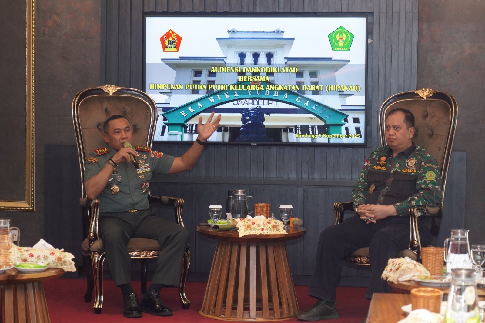 BANDUNG, Ifakta.co – Komandan Kodiklatad Letjen TNI Mohamad Hasan menerima audiensi dari Dewan Pengurus Daerah Himpunan Putra Putri Keluarga Angkatan Darat (Hipakad) Provinsi Jawa Barat, bertempat di Lounge Room Gedung Baladhika Kodiklatad, Rabu (5/11/2025).