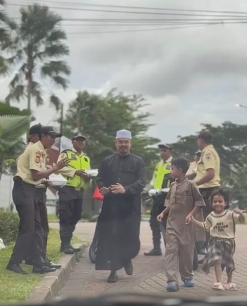 Pantauan media di lokasi, Mursalin tampak turun langsung bersama istri tercintanya dan kedua anak mereka yang masih kecil. Dengan penuh kehangatan, keluarga kecil itu membagikan nasi kotak kepada warga sekitar — mulai dari petugas keamanan, pemulung, hingga pekerja harian yang melintas.