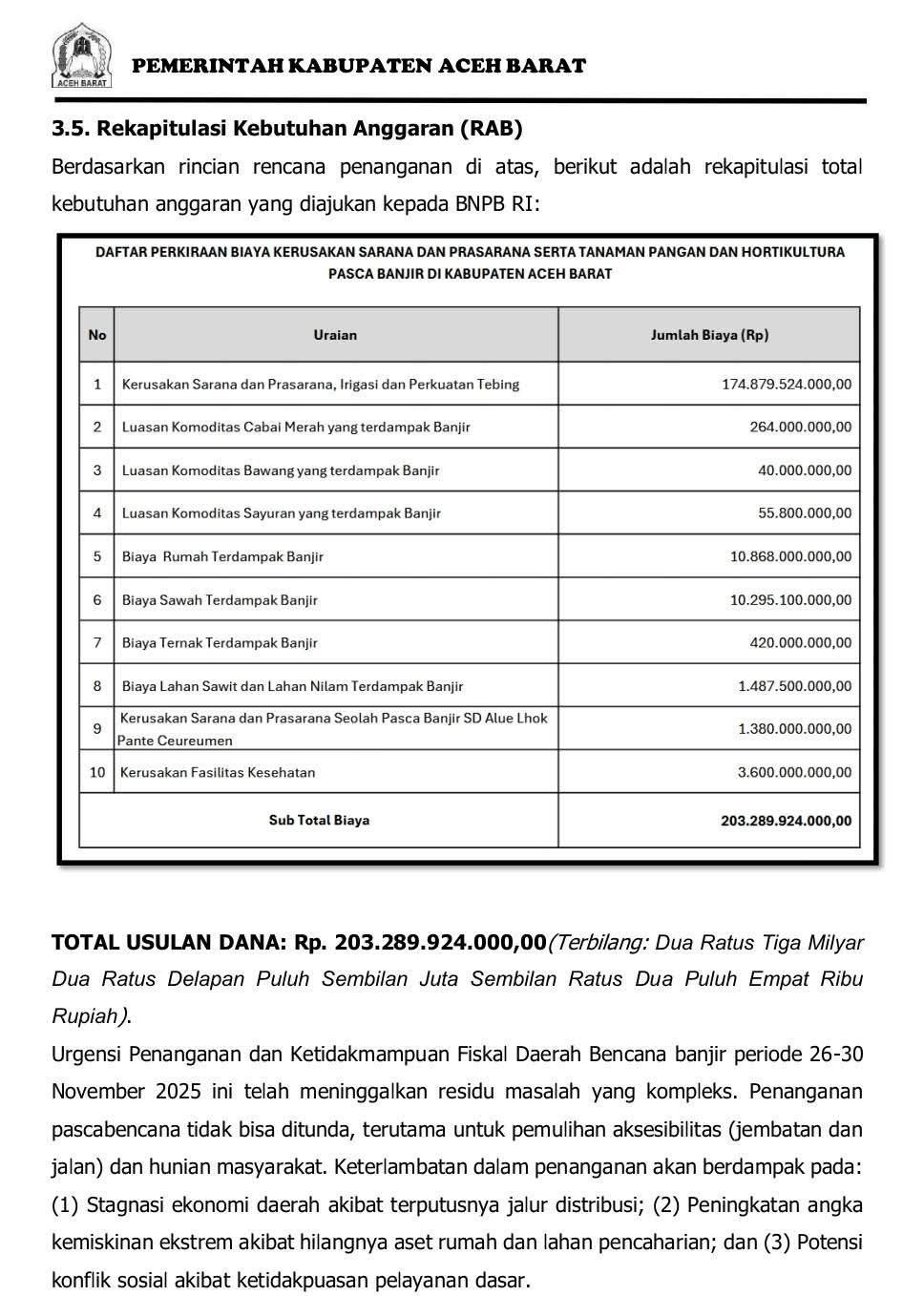 ACEH BARAT, ifakta.co – Pemerintah Kabupaten Aceh Barat mengajukan usulan anggaran sebesar Rp203,28 miliar kepada Badan Nasional Penanggulangan Bencana (BNPB) untuk percepatan penanganan pemulihan pascabanjir yang melanda wilayah tersebut pada 26–30 November 2025.