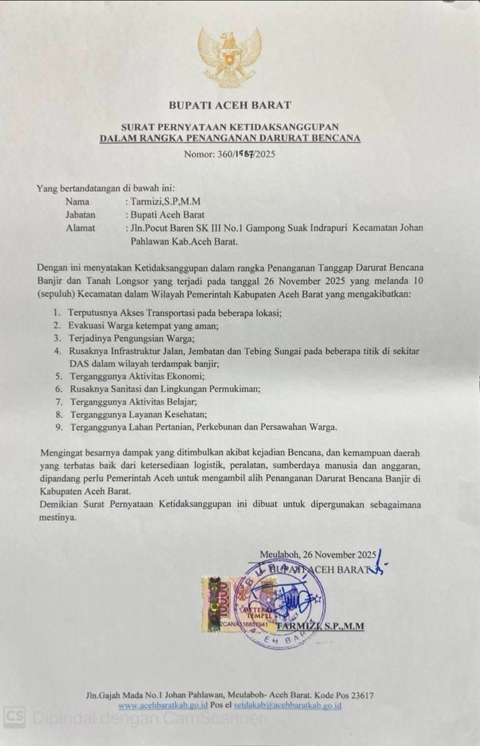 ACEH BARAT, ifakta.co – Pemerintah Kabupaten Aceh Barat menyampaikan permohonan bantuan logistik dan percepatan pemulihan infrastruktur vital kepada pemerintah pusat setelah banjir besar menerjang wilayah tersebut sejak 26 November 2025.