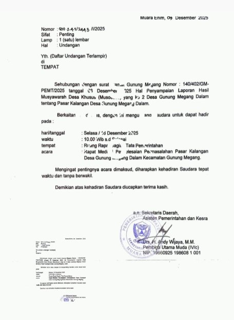 Menurut informasi yang dihimpun, masyarakat awalnya merasa tenang setelah menerima surat edaran undangan mediasi yang dikeluarkan oleh pemerintah kabupaten (terlampir). Surat dengan Nomor: 500-2-4-5/2443/II/2025, tertanggal 09 Desember 2025, mengundang berbagai pihak untuk hadir dalam rapat mediasi penyelesaian permasalahan Pasar Kalangan Desa Gunung Megang Dalam Kecamatan Gunung Megang, yang sedianya akan dilaksanakan pada Selasa, 16 Desember 2025.