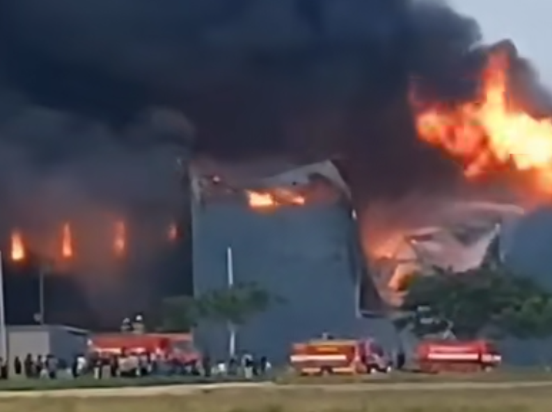 Dari pantauan di lokasi, warga dan pekerja tampak berdiri di area luar pagar, menyaksikan upaya pemadaman sambil menjaga jarak aman. Kobaran api yang besar membuat sebagian atap gudang tampak ambruk.