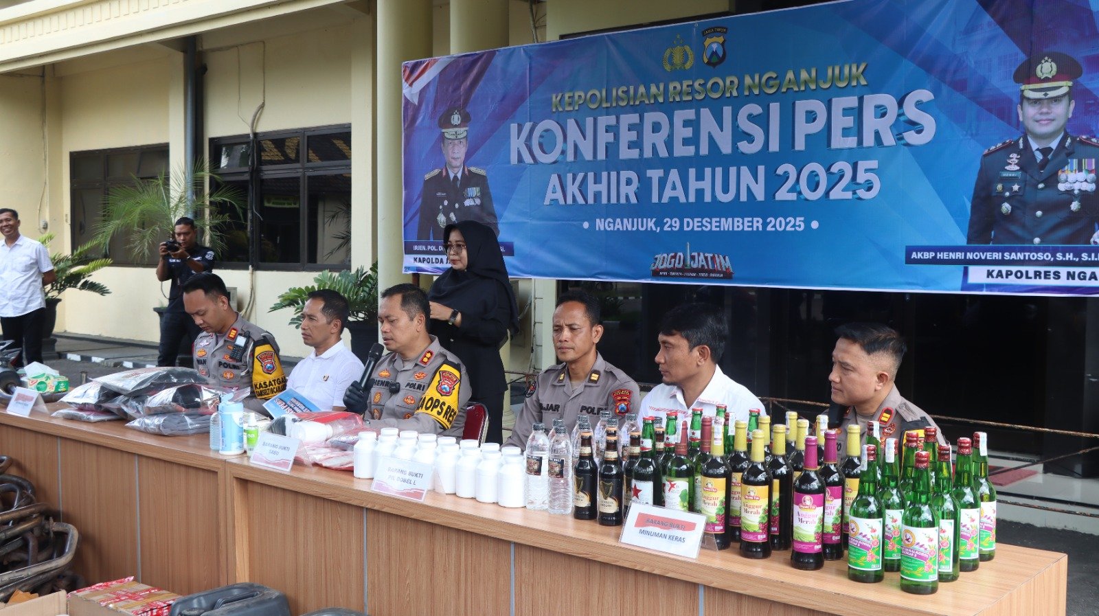 NGANJUK, ifakta.co– Polres Nganjuk menggelar konferensi pers akhir tahun untuk memaparkan capaian kinerja dan situasi kamtibmas sepanjang 2024 hingga 2025. Kegiatan dipimpin langsung Kapolres Nganjuk AKBP Henri Noveri Santoso didampingi Kasat Reskrim, Kasat Resnarkoba, Kasat Samapta, Kasat Lantas, serta Kasi Humas Polres Nganjuk, Senin (29/12/2025).