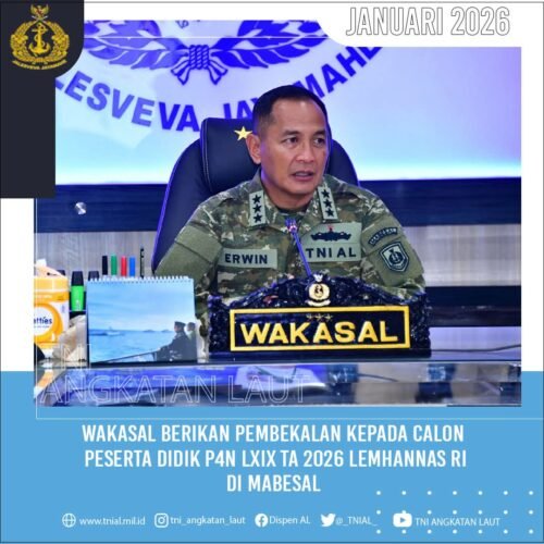 JAKARTA, ifakta.co – Wakil Kepala Staf Angkatan Laut (Wakasal) Laksamana Madya TNI Erwin S. Aldedharma mewakili Kepala Staf Angkatan Laut (Kasal) Laksamana TNI Dr. Muhammad Ali memberikan pembekalan kepada 13 Perwira Menengah (Pamen) TNI AL calon peserta didik Penyiapan dan Pemantapan Pimpinan Nasional (P4N) LXIX Tahun Anggaran 2026 di Lemhannas RI. Kegiatan tersebut berlangsung di Mabesal, Cilangkap, Jakarta Timur, Jumat (9/1).