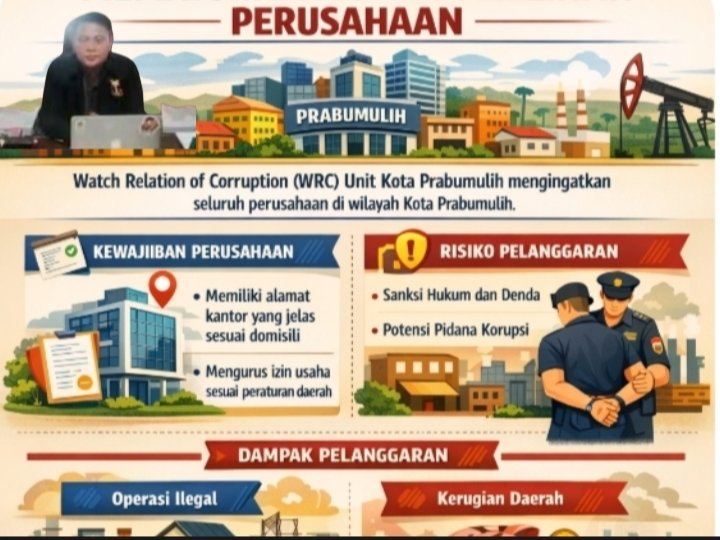 PRABUMULIH, ifakta.co – Organisasi aktivis antikorupsi Watch Relation of Corruption (WRC) Unit Kota Prabumulih mengingatkan seluruh perusahaan yang beroperasi di wilayah Kota Prabumulih agar mematuhi ketentuan domisili kantor dan perizinan daerah.