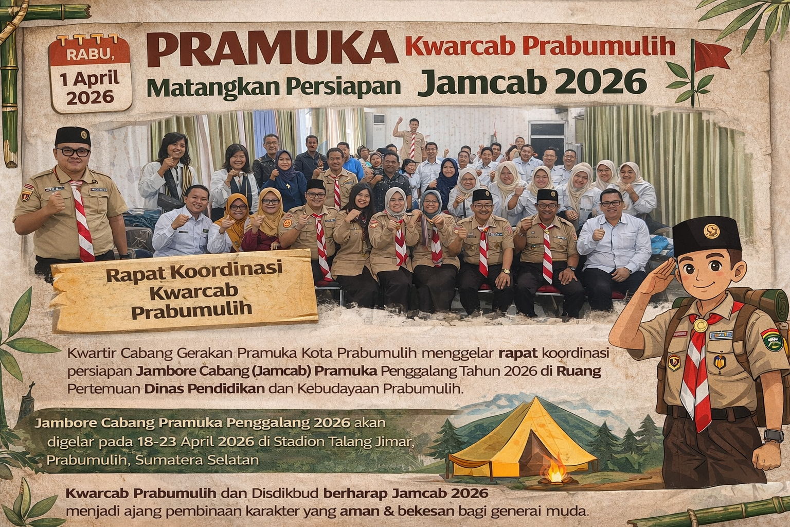 “Jamcab merupakan ajang penting bagi Pramuka Penggalang. Kami ingin seluruh gugus depan dapat mempersiapkan peserta secara maksimal, baik dari sisi mental, keterampilan, maupun kelengkapan perkemahan,” ujar Hermanto.